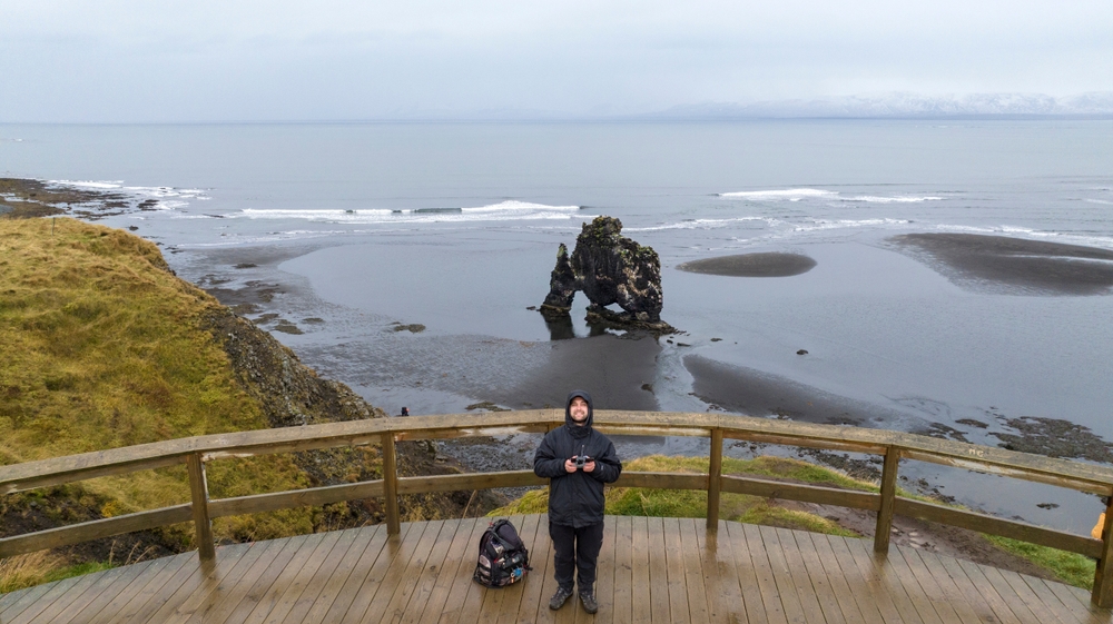 Hvítserkur is a 15-metre-tall basalt sea stack on the west coast of the Vatnsnes Peninsula, south of Akureyri. It rises from the sea at low tide and is shaped, with only modest imagination, like a rhinoceros drinking from the water.